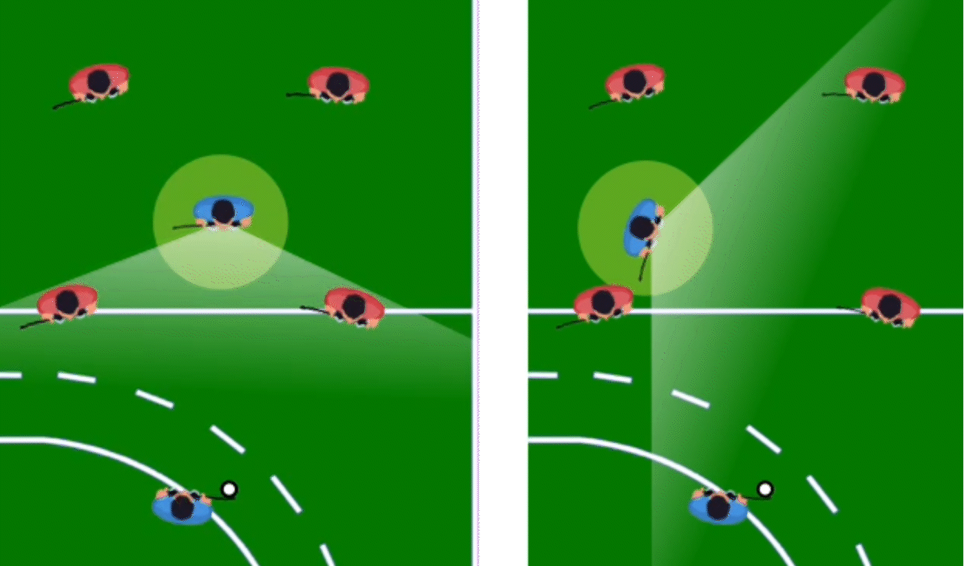 A player who’s about to receive the ball will typically try to pre-scan by turning their head over their shoulder. But if they approach the ball head-on, their ability to scan the field will be very limited.