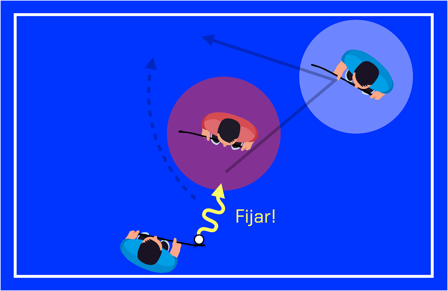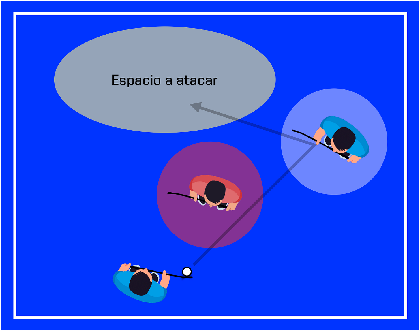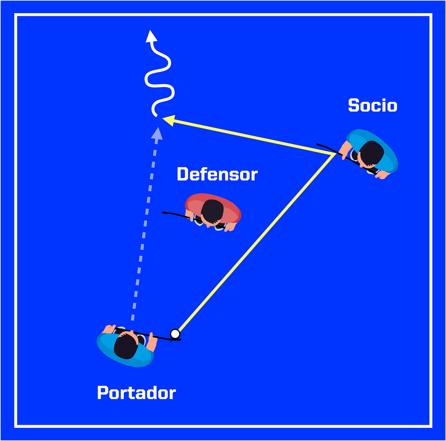 To facilitate communication from now on, we will refer to the Carrier (the one carrying the ball - Portador in the image), the Partner (the teammate with whom the wall pass is performed - Socio in the image), and the Defender (the opponent defending the action - Defensor in the image).