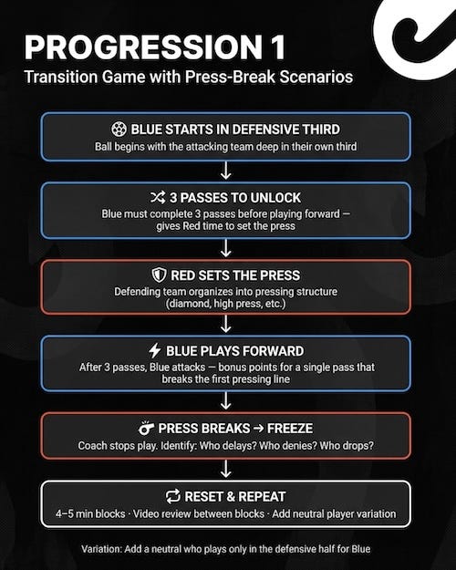 Start with a structured small-sided game that forces the press-break situation repeatedly. Here’s a format that works well: