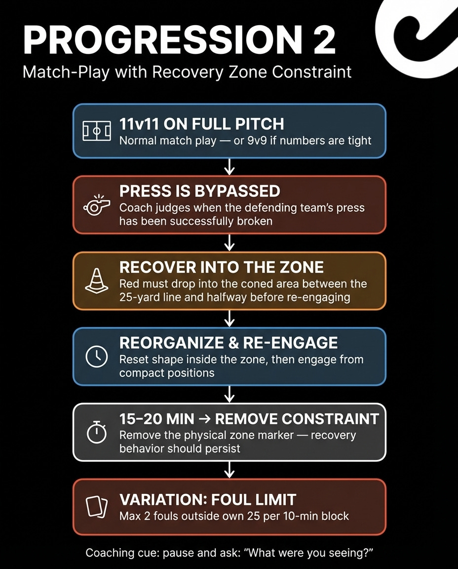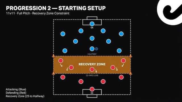 What do I mean by “defined zone”? Mark out an area from the 25-yard line to the halfway line with cones. When the press breaks, the defending team must recover into that zone before they can engage the ball again. This forces them to prioritize dropping and resetting rather than chasing all over the field.