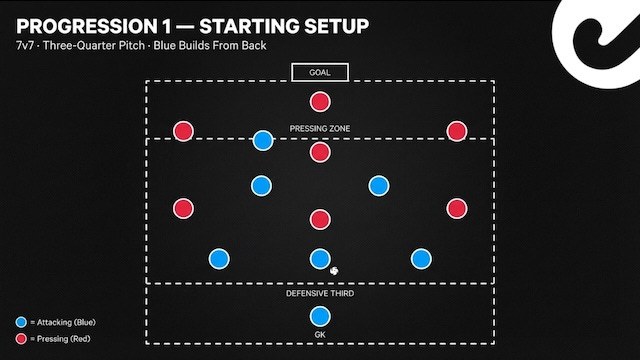 Play 7v7 or 8v8 on a three-quarter pitch. The attacking team (let’s call them blue) is trying to score in one goal. The defending team (red) sets up in a defined pressing structure—could be your diamond, could be your high press, whatever you usually use.